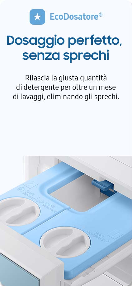 - Ecodosatore eroga la quantità di detergente e ammorbidente adatta per ciascun carico.
